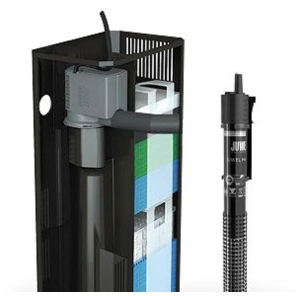 L’aquarium est également doté d’un système de filtration interne Bioflow 8.0 JUWEL qui loge en plus le chauffage AquaHeat 300W, réglable de 20° à 30°C.
