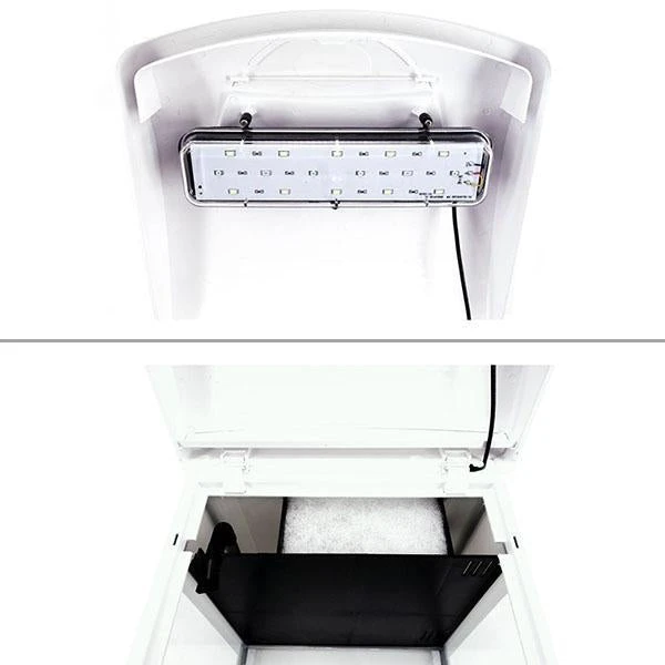 La galerie d’éclairage se trouve sous le couvercle de l’aquarium. Le couvercle possède une petite trappe d’ouverture à l’avant, pour faciliter le nourrissage des poissons.