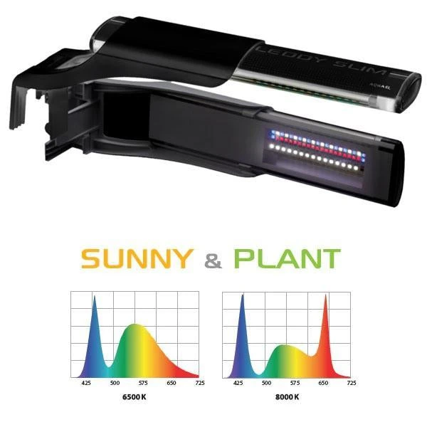 La lampe contient deux rangées de LEDs dont la moitié d’entre elles sont des LEDs Sunny (lumière du jour) 6500°K, émettant une lumière forte et qui fournit d’excellentes conditions pour la croissance des plantes d’aquarium. L’autre moitié se composent de LEDs Plant 8000°K, émettant une lumière rosée, qui complète le spectre pour permettre de maintenir des plantes assez exigeantes.