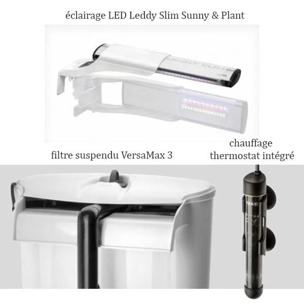 Le filtre suspendu VersaMax 3 avec rejet en cascade offre une capacité de filtration importante avec un débit puissant de 1200 L/h. Il ne prend pas de place dans l’aquarium car il se monte sur la paroi arrière du nano-aquarium et permet de purifier l’eau grâce à ses paniers de filtration amovibles. Le débit du filtre est réglable se qui permet de l’ajuster selon vos besoins. Un chauffage de 50W est inclus afin de maintenir une température précise grâce au thermostat intégré.