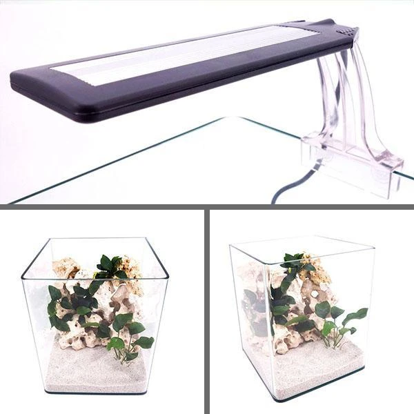 L’aquarium NanoTank Cubo System 20 LED est équipé d’un système d’éclairage compact, le Vega Fresh AMTRA à spectre complet avec des leds blanches, rouges et bleus pour une croissance optimale des plantes aquatiques. Ce plafonnier LED s’installe facilement au bord de la vitre de n’importe quels petits aquariums grâce à sa fixation pratique (épaisseur de vitre max. 12mm). Sa puissance est de 6,8 W.
