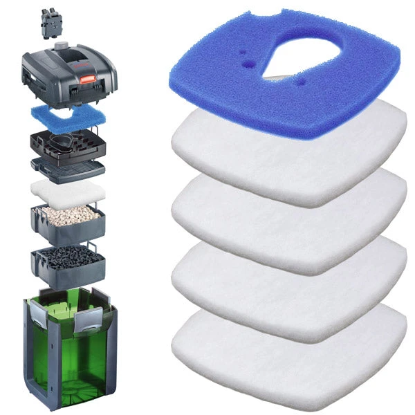 Ce Set de cinq mousses filtrantes EHEIM contient une mousse bleue de préfiltration et quatre coussins de ouates de remplacement, pour être utilisé avec les filtres externes suivants :
