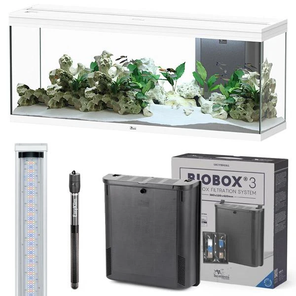 Splendid 150 AQUATLANTIS Standard est un aquarium de 298 L complètement équipé avec un éclairage LED intégré et un système de filtration efficace (filtre interne). Son meuble au design moderne couleur blanche est disponible en option.