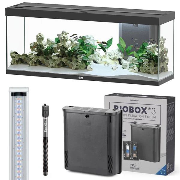 Splendid 150 AQUATLANTIS Standard est un aquarium de 298 L complètement équipé avec un éclairage LED intégré et un système de filtration efficace (filtre interne). Son meuble au design moderne couleur noire est disponible en option.