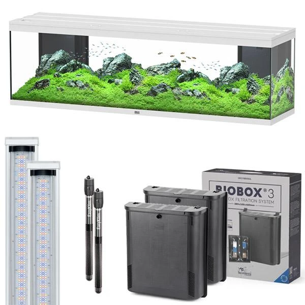 Splendid 200 AQUATLANTIS est un aquarium de 500 L complètement équipé avec un éclairage LED intégré et un système de filtration efficace (deux filtres internes). Son meuble au design moderne couleur blanche est disponible en option.