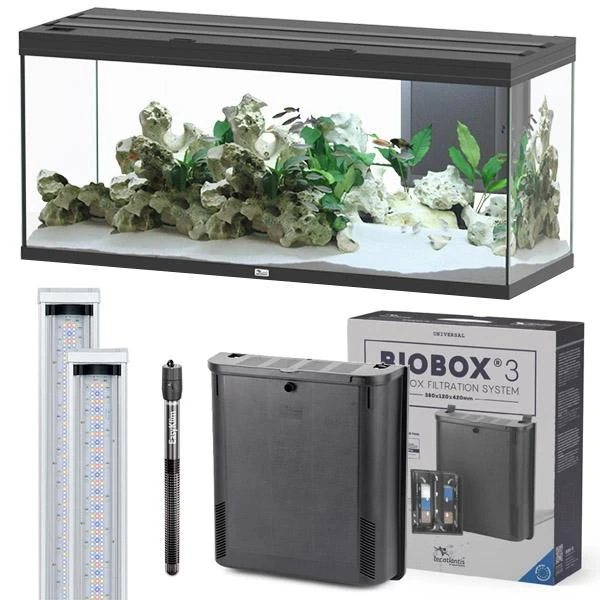 Modèle : BioBox 3 Pompe : EasyFlux 900 Dimensions : (L) 38 x (l) 12 x (H) 42 cm Cartouches filtrantes : ouate, mousse bleue fine, mousse bleue large, charbon actif, bille d’argile