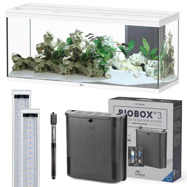 Modèle : BioBox 3 Pompe : EasyFlux 900 Dimensions : (L) 38 x (l) 12 x (H) 42 cm Cartouches filtrantes : ouate, mousse bleue fine, mousse bleue large, charbon actif, bille d’argile